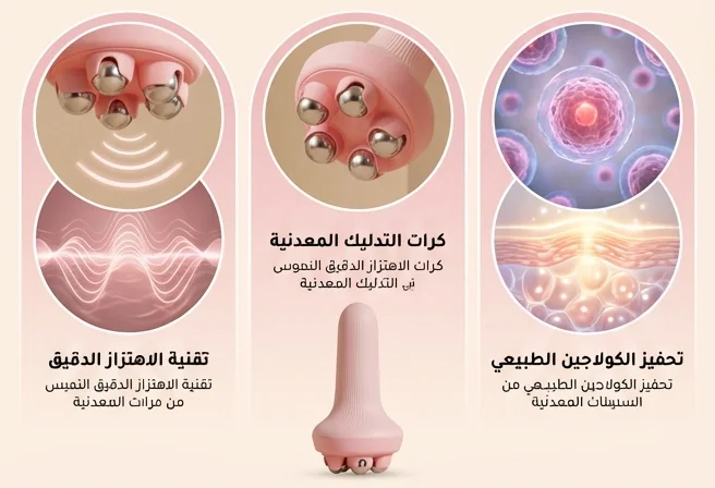 كرات تدليك فولاذية: يتميز بقاعدة تحتوي على كرات معدنية دوارة تنساب بسلاسة على البشرة، مما يساعد في تنشيط الدورة الدموية وتقليل التورم.